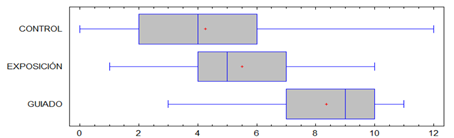 Diagrama de cajas y bigotes para los resultados del Grupo 3- guiado (W=8, p=0,0001)