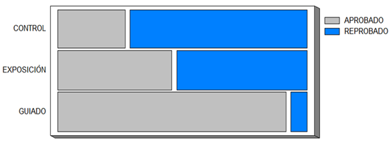 Con el análisis de los resultados del pretest podemos observar que en ninguno de los tres grupos, el porcentaje de estudiantes con resultado aprobatorio alcanzo el 50%, siendo el grupo 3 ( guiado) con un 40,4% el tratamiento con mayor cantidad de estudiantes que aprueban el primer cuestionario, sin embargo, como se mencionó anteriormente la prueba no revela diferencias estadísticamente significativas (x2 = 1,8; p=0,05) con relación a los estudiantes que aprobaron en los otros dos grupos ( control con un 31,9% y exposición con un 27,7%). Figura 1