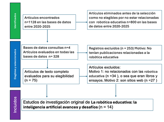 Proceso de selección de artículos de investigación original de la robótica educativa: la inteligencia artificial avances y desafíos 2020 – 2025.