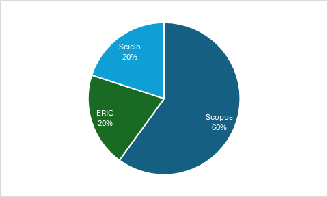La distribución porcentual de fuentes utilizadas en la revisión científica sobre tecnología educativa deja entrever que la base de datos Scopus domina con un 60%, lo que indica una fuerte dependencia de esta base de datos reconocida por su rigurosidad y alcance internacional. SciELO aportan cada una un 20%, reflejando un equilibrio entre literatura especializada y producción científica latinoamericana. ERIC contribuye con un 20%, destacando su relevancia en el ámbito educativo. Sorprendentemente, ScienceDirect no presenta representación (0%), lo que podría sugerir criterios de exclusión específicos o una baja pertinencia temática. Esta visualización permite identificar claramente el peso relativo de cada fuente y orientar decisiones metodológicas en futuras búsquedas. Véase la Figura 5.