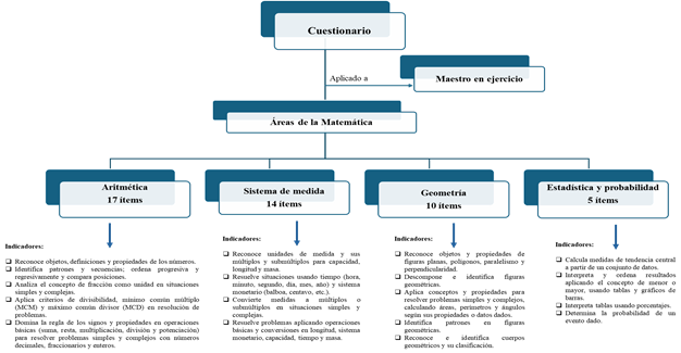 El cuestionario estuvo compuesto por 46 ítems, distribuidos por área, las preguntas eran de selección única, redactada de forma clara y con cuatro opciones de respuesta. Su propósito fue evaluar el nivel de conocimiento matemático de los maestros en ejercicio, en correspondencia con las competencias establecida en el currículo del programa de Matemática de primer a sexto grado (MEDUCA, 2014), tal como se presenta en la Figura 2.