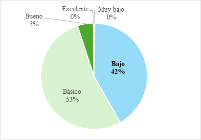 La Figura 4, presenta los resultados de nivel de logro de conocimiento matemático alcanzado por los maestros. En general se observa que el nivel de conocimiento Bajo (42%) y Básico (53%) alcanzan en total un 94.8%, lo cual es preocupante.
