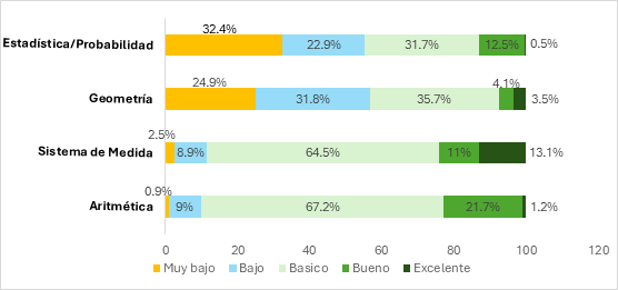 Por el contrario, las áreas de Aritmética y Sistema de Medida muestran un predominio del nivel básico (67.2 % y 64.5 %, respectivamente) y una proporción más elevada de resultados buenos y excelentes.