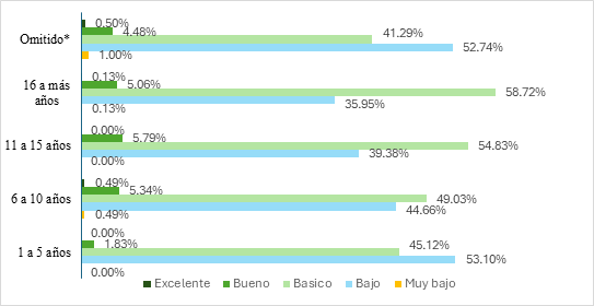 La figura 6, muestra los niveles de conocimientos matemáticos de los maestros, en función de los años de servicio. Se observa que sin importar los años, la mayor cantidad de maestros se encuentra en el nivel de conocimiento Bajo y nivel Básico. Llama la atención que esto se presenta principalmente entre los maestros con 16 años o más años de servicio (más experiencia docente). Esto sugiere que la longevidad en el servicio no asegura un mejor manejo en las áreas de Matemática.