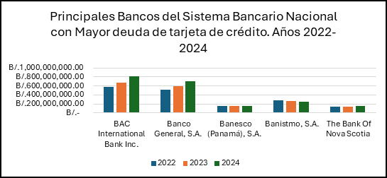 Principales Bancos del Sistema Bancario Nacional con mayor deuda de tarjeta de crédito 2022 al 2024.