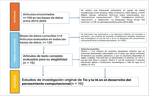 Proceso de selección de artículos de investigación original de las Tic y la IA en el desarrollo del pensamiento computacional 2015 – 2025.