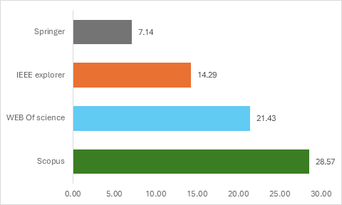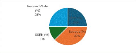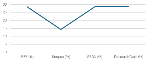 El gráfico muestra que IEEE lidera con 30% de representación, destacándose como la fuente más utilizada en el análisis. SSRN y ResearchGate siguen con 25% cada una, reflejando una participación equilibrada en estudios académicos. Scopus tiene la menor proporción (15%), lo que sugiere una cobertura más limitada en el contexto evaluado.