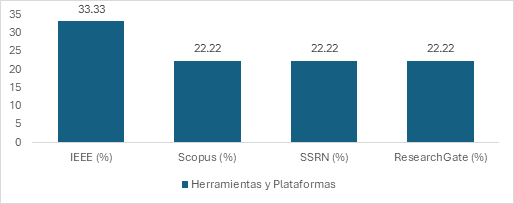 El criterio "Herramientas y Plataformas" concentra el mayor porcentaje de artículos en IEEE (33.33%), lo que sugiere una fuerte presencia de investigaciones tecnológicas en esa base. En contraste, Scopus, SSRN y ResearchGate muestran una distribución equitativa (22.22%) para ese mismo criterio, lo que indica una cobertura más diversificada pero menos especializada. Esta tendencia sugiere que IEEE se posiciona como la fuente más robusta en cuanto a innovación técnica aplicada a la educación, mientras que las otras bases complementan con enfoques pedagógicos, sociales o interdisciplinarios.