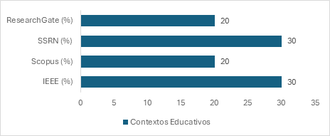 Se muestra la distribución porcentual del criterio "Contextos Educativos" en cuatro bases de datos clave. IEEE y SSRN lideran con un 30% cada una, lo que indica que estas plataformas concentran una mayor proporción de estudios relacionados con entornos educativos, posiblemente desde enfoques tecnológicos (IEEE) y socioeducativos (SSRN). En cambio, Scopus y ResearchGate presentan un 20% cada una, lo que sugiere una participación más equilibrada pero menos dominante en este criterio.