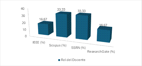 Rol del Docente muestra una distribución porcentual clara entre cuatro bases de datos. Scopus y SSRN lideran con un 33.33% cada una, lo que indica que estas plataformas concentran la mayor cantidad de estudios relacionados con el papel del docente, posiblemente desde enfoques pedagógicos, institucionales o de formación profesional. En contraste, IEEE y ResearchGate presentan un 16.67% cada una, lo que sugiere una menor representación de este criterio, quizás por su orientación más técnica o colaborativa.
