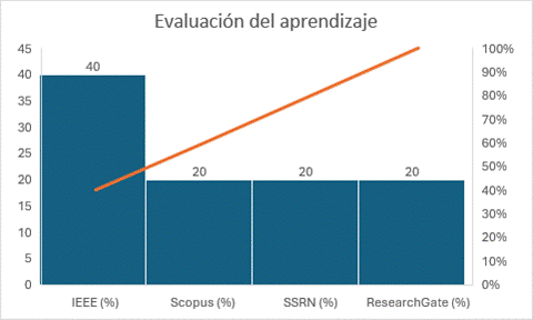 Evaluación del aprendizaje muestra que IEEE concentra el 40% de los artículos relacionados con este criterio, lo que sugiere una fuerte orientación hacia enfoques tecnológicos en la medición del aprendizaje. Las otras tres bases —Scopus, SSRN y ResearchGate— comparten cada una un 20%, indicando una participación más equilibrada pero menos dominante. La línea naranja superpuesta, que asciende hasta el 100%, representa la acumulación porcentual, útil para visualizar el peso relativo de cada fuente en el total.