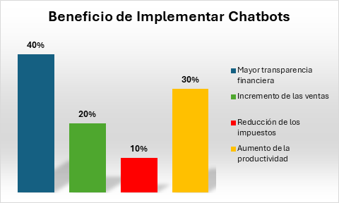 Los resultados de la Figura 2, revelan que el 40% de los encuestados identificaron la obtención de una mayor transparencia financiera como el principal beneficio de establecer chatbots en los procedimientos de registro de transacciones financieras. Por otro lado, el 30% de los participantes señaló que otro beneficio importante sería el aumento de la productividad entre los colaboradores. El 20% opina que las ventas se pueden incrementar y un 10% expresa que se puede reducir impuestos.