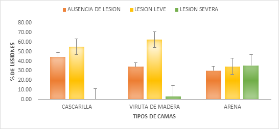 Cuando se evaluaba la probabilidad de aparición de lesiones de acuerdo con el tipo de cama (Figura 3), se evidenció que la menor probabilidad de lesiones la presentaba la cama de cascarilla de arroz y la de mayor, la cama de arena.
