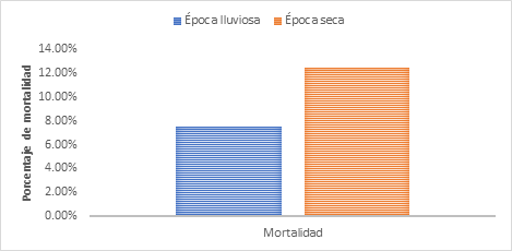 Al evaluar la mortalidad, se observa un aumento significativo de un 7.5% en la época lluviosa hasta llegar al 12.5% en la época seca (Figura 4).