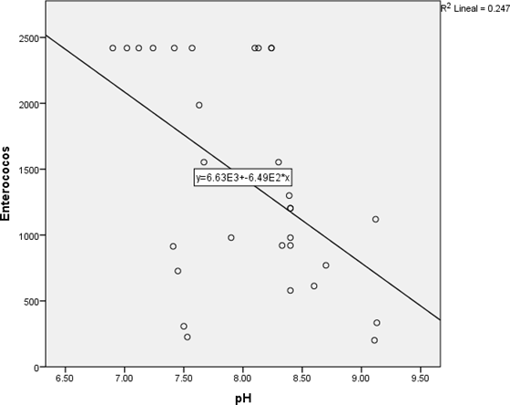 Al correlacionar los recuentos de enterococos con las otras variables no se encontró una correlación con la temperatura, conductividad y los SDT (P > 0.05); pero si con el pH (P = 0.007). Esta correlación resultó negativa (Figura 4).