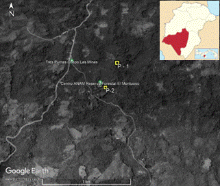 Los puntos de muestreo se ubicaron en uno de los afluentes que alimentan al río La Villa, dentro de la RFEM, en la localidad de Tres Puntas, corregimiento de Chepo. Se establecieron dos sitios (Figura 1): el punto P-1, situado a 626 m s. n. m. en las coordenadas 7°44'7.07"N; 80°47'54.55"O, y el punto P-2, a 609 m s.