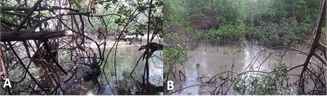 Líbano: This extensive mangrove area exhibits a high presence of red mangrove (Rhizophora mangle), alongside black mangrove (Avicennia germinans). Water access for this site is through channels, and the substrate consists of mud (Fig. 2a). Right along the inner edge of the mangrove, with a sandy-muddy substrate, R. mangle is the dominant species, with L. racemosa and P. rhizophorae also present (Fig. 2b).