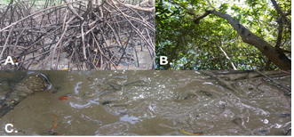 Substrates where the samples were taken (A. root; B. trunk; C. mud).