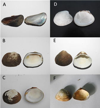 Chame Bay Pelecypods: A. Mytella guyanensis. B. Anadara tuberculosa, C. Polymesoda notabilis, D. Leukoma aspérrima, E. Polymesoda inflata, F. Panamicorbula ventricosa.