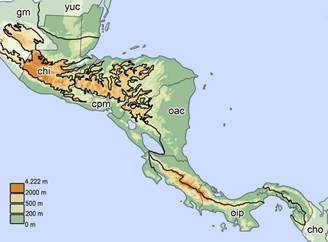 Chiapas (chi). Comprende desde el sur de México (Chiapas), Centro-Sur Guatemala, Honduras, El Salvador y parte NO de Nicaragua; en esencia es la Sierra Madre de Chiapas, entre la cota de 500-2,000msnm de altitud, las serranías se extienden hacia el límite de Nicaragua, decreciendo su altitud. La vegetación es heterogénea contando con varios tipos de bosques, sabanas y matorrales (Dinerstein et al. 1995; Morrone 2001a, 2001b) (Fig 2).