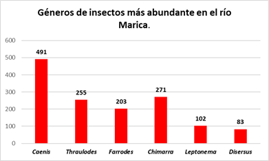 Géneros de insectos más abundantes recolectados en el río Marica.