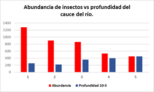 Al comparar la profundidad del río con la diversidad de insectos (Fig. 5) se obtuvo que estos son mayores a menor profundidad. Esto lo apoyan Merritt, et al. (2008) en el cual los cuerpos de agua poco profundos tienden a tener más oxígeno disuelto y luz solar, lo que fomenta el crecimiento de plantas acuáticas y algas, que a su vez proporcionan alimento a los insectos acuáticos.