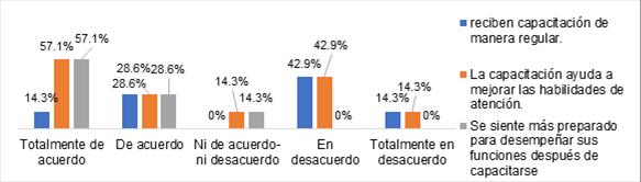 Se muestra también la percepción de cómo ayuda la capacitación a mejorar las habilidades de atención: 57.1% de la población encuestada está totalmente de acuerdo, 28.6% de acuerdo, 14.3% ni de acuerdo ni en desacuerdo y un 14.3% totalmente en desacuerdo. Por último, se muestra que, a pesar de la irregularidad de las capacitaciones, se sienten preparados para desempeñar sus funciones en un 57.1% totalmente de acuerdo), 28.6% de acuerdo) y un 14.3% (ni de acuerdo ni en desacuerdo).