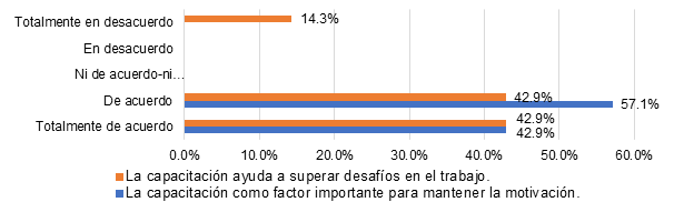 En la figura 3 se presentan los resultados obtenidos sobre la capacitación enfocada en la motivación y cómo enfrentan los colaboradores los desafíos en la actividad hotelera. Respecto al primer aspecto de la capacitación como elemento crucial para la motivación, 42,9% está totalmente de acuerdo y 57,1% de acuerdo.