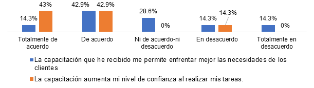 En la figura 4 se muestran los aspectos de cómo la capacitación les ha permitido afrontar las necesidades de los clientes: el 14.3% está totalmente de acuerdo, 42.9% de acuerdo, un 28.6% ni de acuerdo ni en desacuerdo, un 14.3% en desacuerdo y totalmente desacuerdo respectivamente. De igual forma, se muestra que consideran que la capacitación aumenta su nivel de confianza al realizar las tareas; un 42.9% está totalmente de acuerdo, otro 42.9% está de acuerdo y un 14.3% está en desacuerdo.