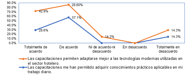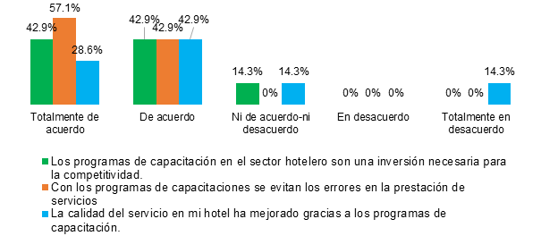 De igual forma, sobre si las capacitaciones permiten adaptarse a las tecnologías modernas que se están utilizando en los servicios de los hoteles, 42.9% está totalmente de acuerdo, 28.6% sí, 14.3% ni de acuerdo ni en desacuerdo y un 14.3% totalmente en desacuerdo.