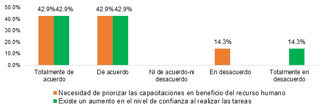 Sobre si existe capacitación y un nivel de confianza al realizar las tareas por parte de los colaboradores, 42,9% está totalmente de acuerdo y 42,9% más, en contraste con solo 14,3% que está completamente en desacuerdo.