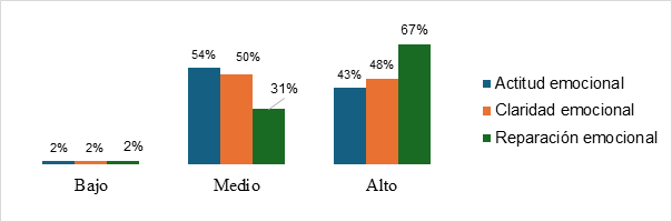En la dimensión Claridad emocional el 50% de los estudiantes se sitúan en el nivel medio, él estar en un nivel medio, sugiere cierta dificultad para identificar o interpretar sus emociones en determinadas situaciones. La dimensión Reparación emocional el 67% de los estudiantes se sitúan en el nivel alto es decir presentan capacidad para reparar o regular sus emociones, lo que sugiere que estos estudiantes encuestados pueden recuperar su equilibrio emocional rápidamente tras situaciones adversas.