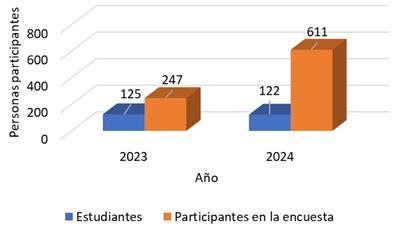 En su segunda fase, se realizó el desarrollo de las charlas e interacciones con la población, así como el proceso de recolección de datos a través de la aplicación de la encuesta. En 2023 se logró una muestra de 247 participantes y en 2024, se incrementó a 611 personas encuestadas (figura 1).