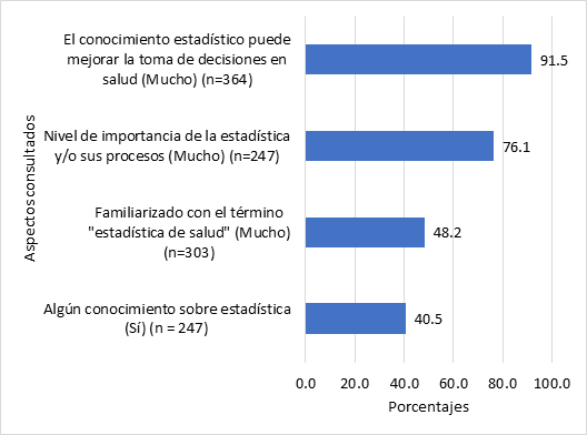 Por ejemplo, el 40.5% de la población intervenida y que respondió el cuestionario manifestó tener algún conocimiento sobre estadística; mientras que un 48.2% indicó estar muy familiarizado con el término “estadística de salud”. Aunque, el conocimiento sobre la estadística y la familiaridad sobre estadística de salud es relativamente escaza se observó un mayor porcentaje que reconoce la importancia de la estadística, incluyendo la recolección de datos, según el 76.1%; aún llamó más atención que 91.5% de los encuestados consideró que el conocimiento estadístico puede mejorar la toma de decisiones en salud.