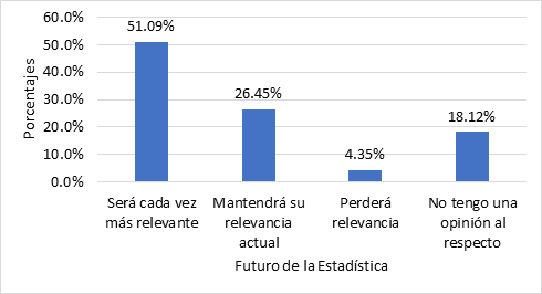 El reconocimiento de la importancia y la utilidad no implica conocimiento; esto se refleja que la sociedad es consciente en que la estadística puede contribuir a tomar decisiones más acertadas, aunque no se tenga pleno conocimiento sobre qué es y cómo se realiza. Tal como se aprecia en la figura 5 en donde más de la mitad de la población considera que el futuro de la estadística en el mundo laboral cada vez más será relevante en contraste con solo el 4.35% que indicó que esta perderá relevancia y el 18.12% que no dio opinión al respecto.