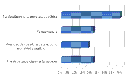 Las personas respondieron que creen que la Estadística en salud es importante para el sistema de salud, donde 39% de las personas indicaron que la recolección de datos sobre salud pública es relevante para este tema, ya que un 21% considera que apoya en el análisis de tendencias en enfermedades, mientras que un 18% opina que apoya en el monitoreo de indicadores de salud, tales como mortalidad y natalidad.